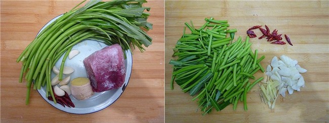 Rau muống rửa sạch thái khúc, tỏi bóc vỏ thái lát, gừng thái sợi, ớt khô cắt làm đôi hoặc làm 3.
