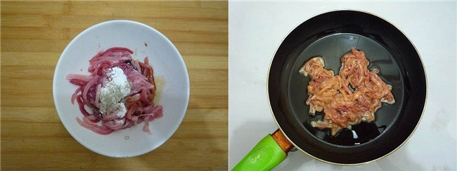 Thịt lợn thái sợi cho vào bát, thêm một ít hạt tiêu, nước tương và một ít bột ngô vào trộn đều. Đun nóng dầu ăn trong chảo, cho thịt vào xào.