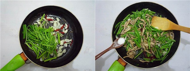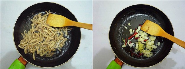 Bạn đảo cho thịt chín chuyển màu thì trút ra bát. Tiếp đó thêm một ít dầu ăn vào chảo và tiếp tục cho tỏi, gừng, ớt vào xào thơm.