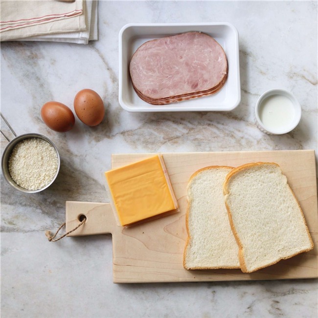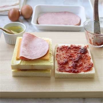 Cắt bỏ phần viền vàng xung quanh bánh mì. Phết mứt dâu và mù tạt vàng vào hai bên mặt bánh, đặt 1 lát phô mai, thịt xông khói lên mặt bánh đã phết mù tạt vàng.