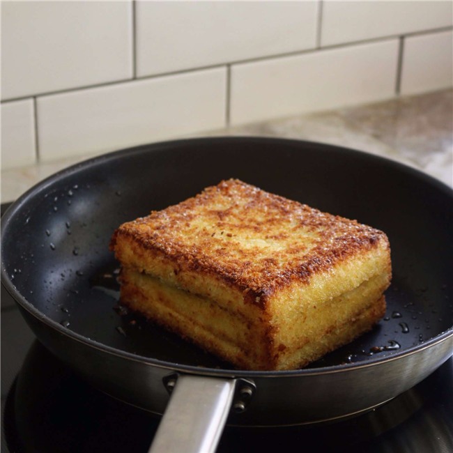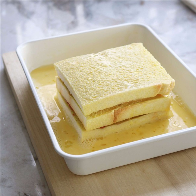 Khuấy đều hỗn hợp trứng, muối, sữa tươi rồi cho phần bánh mì đã chuẩn bị vào nhúng đều các mặt.
