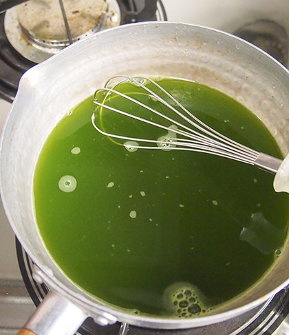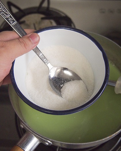 Khi nồi nước lá dứa cốt dừa bắt đầu bột hơi thì từ từ cho phần hỗn hợp đường bột thạch đã trộn vào, vừa cho vừa khuấy đều.