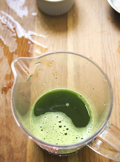 Lá dứa rửa sạch, cắt nhỏ, cho vào máy xay sinh tố xay nhuyễn cùng với 500ml nước. Sau đó lọc lấy nước cốt.