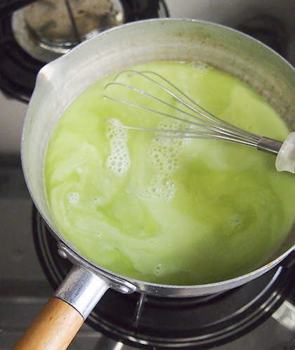 Cho lá dứa vào nồi, bật bếp ở lửa vừa, đổ nước cốt dừa vào, vừa đổ vừa khuấy đều.