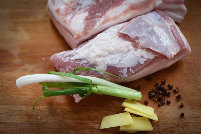 Đặt thịt, vài lát gừng và hành lá vào nồi nước lạnh rồi để to lửa và luộc trong khoảng 30-40 phút.