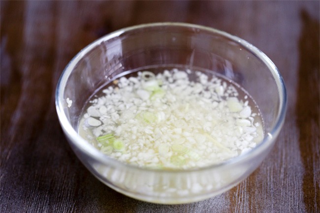Trong lúc đó, cho gừng, tỏi, hành lá, và muối vào 1 tô nhỏ đựng 100ml nước ấm. Ngâm trong khoảng 5-10 phút.