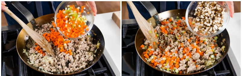 Nêm muối và tiêu. Cho cần tây, cà rốt và nấm vào trộn đều.