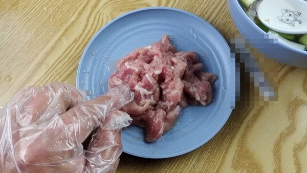 Tiếp theo đổ phần nước gừng hành đã chuẩn bị sẵn vào thịt đã thái, sau đó nắm trộn, chắt nước và vớt ra. Cứ làm như thế khoảng 5 lần là thịt sẽ ngấm nước hành gừng, khi nấu thịt sẽ rất mềm. Ở lần cuối bạn dùng tay vắt kiệt nước cho thịt được khô ráo.