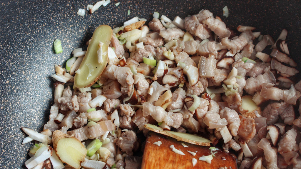 Cho hành, tỏi, gừng và nấm hương vào xào.