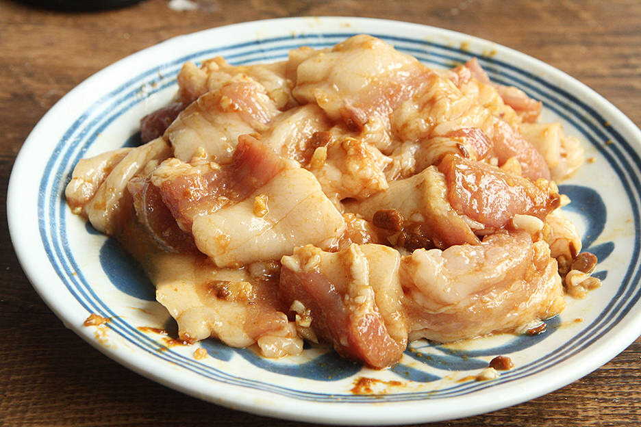 Cho thịt đã thái mỏng vào bát. Thêm dầu hào, rượu nấu ăn, nước tương, tỏi bằm nhỏ. Trộn đều cho ngấm gia vị. Dùng màng bọc thực phẩm bọc kín lại, cho vào ngăn mát tủ lạnh chừng 45 phút đến 1 giờ. Bước này chính là chìa khoá giúp món thịt ba chỉ hấp tạo nên hương vị đậm đà.