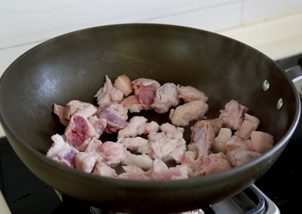 2. Cho thịt vào nồi xào nhưng không cho dầu. Để lửa nhỏ vừa phải cho thịt được săn lại.