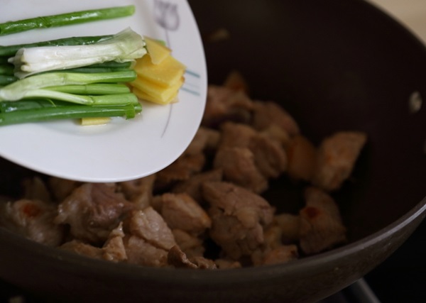 3. Sau đó cho đường phèn hoặc đường trắng, hành lá và gừng vào, xào cho đến khi đường tan ra, ngấm vào thịt.
