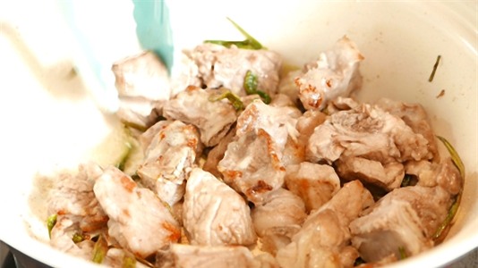 Tiếp đến cho sườn vào đảo qua vài lần cho đến khi sườn hơi cháy cạnh.