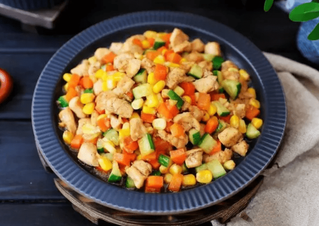 2. Cho nóng chảo, thêm dầu ăn và hành tím vào phi thơm. Sau đó, cho ức gà vào, đảo nhẹ. Tiếp đó, cho cà rốt, ngô ngọt, đảo đôi ba lần. Sau đó, cho dưa chuột và bí ngòi vào. Đảo đều tất cả. Khoảng 3-5 phút thì nêm nếm cho vừa miệng. Cuối cùng, rắc chút hạt tiêu vào cho thơm.
