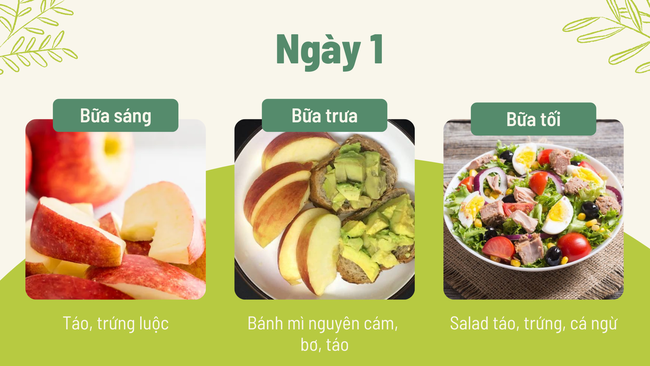 Bữa tối: Salad táo, trứng, cá ngừ. Định lượng các nguyên liệu gồm 1 quả trứng luộc, 1 hộp cá ngừ đóng hộp, 1/2 quả táo, 5-10 quả cà chua bi, 30gr ngô ngọt đóng hộp, 1 cây xà lách, chanh, dầu olive.