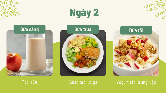 Bữa tối: Yogurt táo và trứng luộc. Định lượng gồm 1/2 trái táo, 1 hộp sữa chua không đường, 10gr hạt tùy thích và 2 quả trứng luộc.