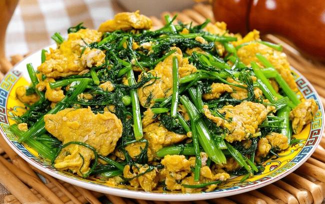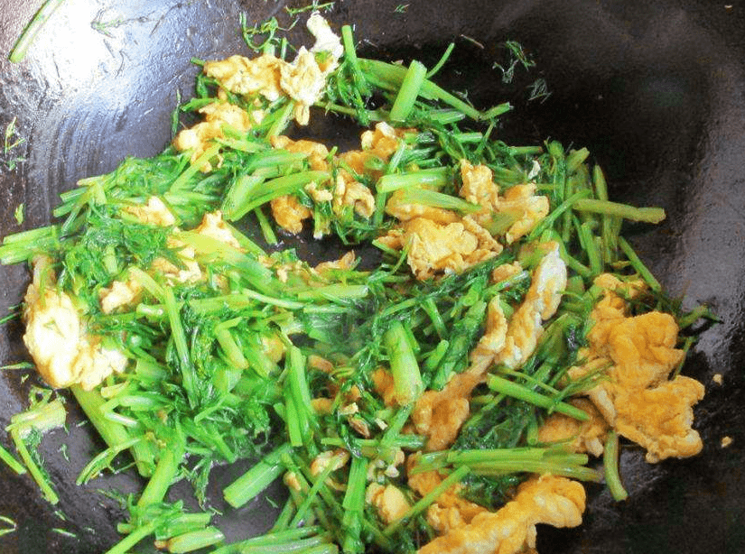 Bước 3: Làm nóng chảo, đổ dầu vào, sau khi dầu nóng đổ trứng vào trước, dùng đũa dàn nhẹ rồi đảo nhẹ, chiên chín, vớt ra đĩa. Thêm chút dầu vào chảo, thêm tỏi vào phi thơm, trút thì là vào xào thêm, nêm vào đó 1 thìa dầu hào, rồi cuối cùng đổ trứng trở lại, đảo đều thêm lần nữa. Thêm hành lá cắt khúc. Chừng 30 giây tắt bếp.