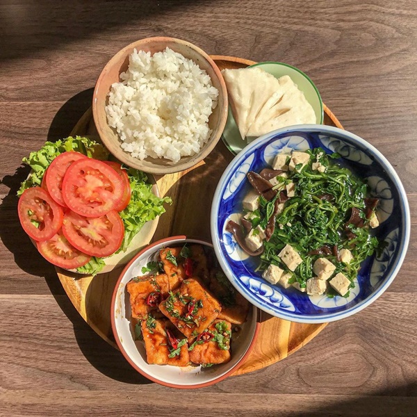 Những món ăn chay tưởng chừng nhàm chán nhưng chỉ cần khéo léo chế biến, trang trí sẽ có mâm cơm đẹp mắt, dinh dưỡng. Tài khoản Accnhi được cộng đồng mê nấu nướng chú ý bởi những bữa cơm chay toàn món đơn giản nhưng được trình bày đẹp mắt. Mâm cơm trong hình gồm các món cà tím rim dừa, nấm xào ớt xanh, dưa leo, cam, cơm nóng.