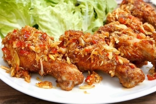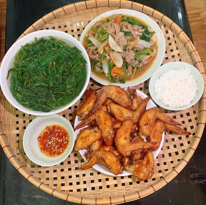 Tối: Thịt bò xào hành tây, Cánh gà chiên mắm, Rau muống luộc.