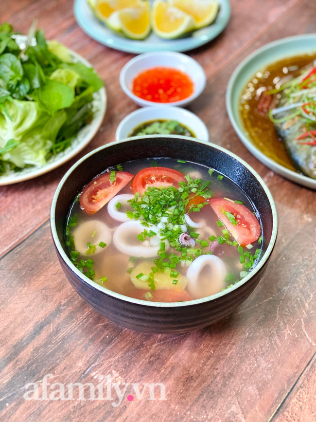 2. Canh mực lá nấu ngót: 2 con mực lá, 1 trái cà chua, 1 miếng dứa (thơm), 1 muỗng cafe mắm, hành ngò, muối, bột ngọt( tuỳ sở thích), tiêu xay