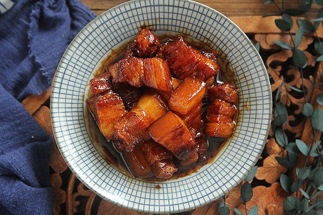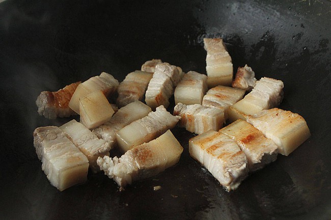 Bước 1: Thịt ba chỉ rửa sạch, thái thịt thành khối dày khoảng 2cm. Cho thịt vào nồi nước lạnh, thêm hành lá và một chút rượu nấu ăn vào đun sôi ở lửa lớn. Chần thịt trong khoảng 4-5 phút rồi vớt ra, rửa sạch bằng nước ấm, để ráo nước.