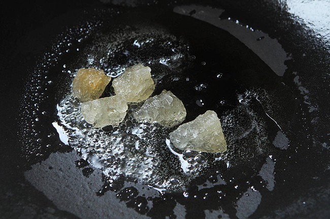 Bước 3: Cho một ít đường phèn vào chảo vừa chiên thịt, đun cho đường tan và chuyển màu cánh gián.