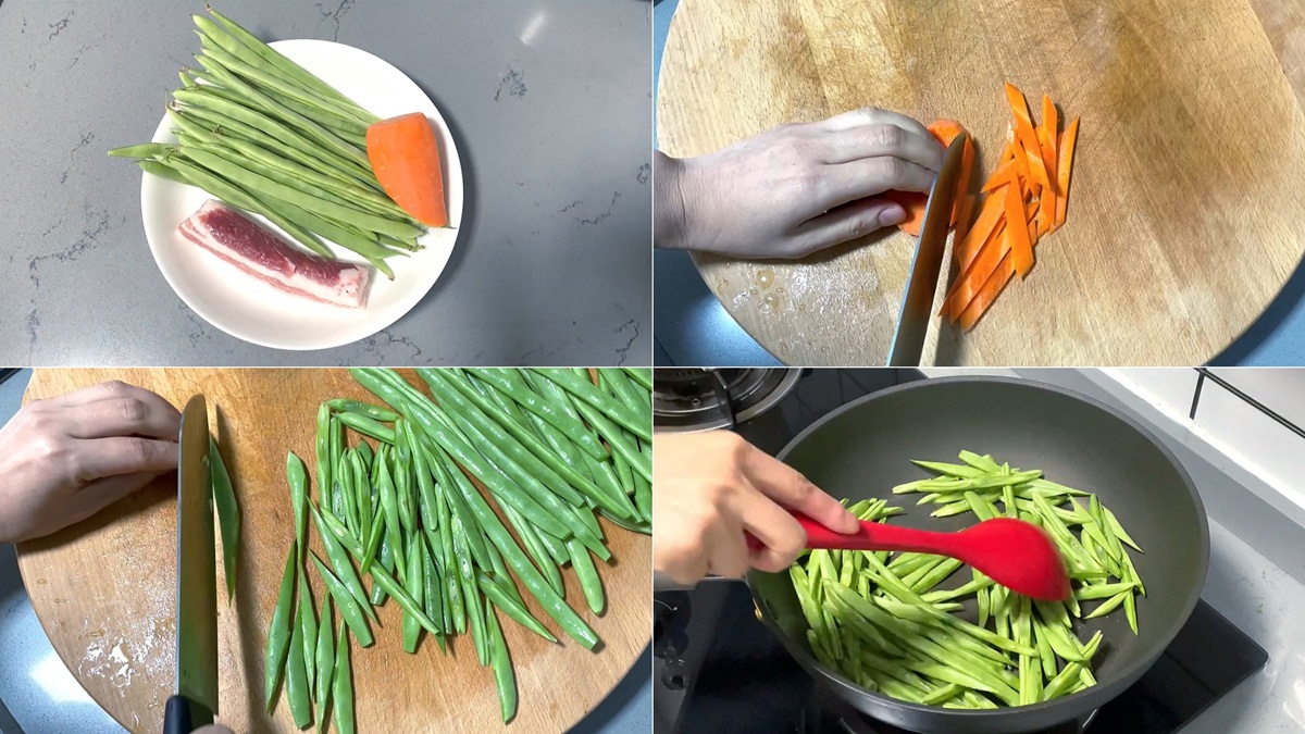 Bước 1: Cà rốt gọt vỏ rửa sạch rồi thái sợi. Đậu cove nhặt bỏ xơ, rửa sạch rồi thái chéo. Đun nóng chút dầu ăn trong chảo, cho đậu vào xào.