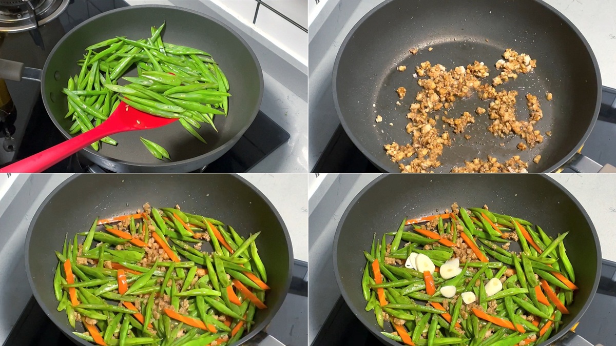Bước 2: Xào khoảng 10 phút là đậu chín, trút ra đĩa. Đổ chút dầu ăn vào chảo đun nóng, cho thịt băm vào xào cho đến khi thịt chuyển màu thì nêm thêm nước tương, rượu nấu ăn. Sau đó đổ đậu cove đã xào và cà rốt vào đảo chung. Cuối cùng thêm tỏi vào xào chung cho đến khi các nguyên liệu chín thì tắt bếp.