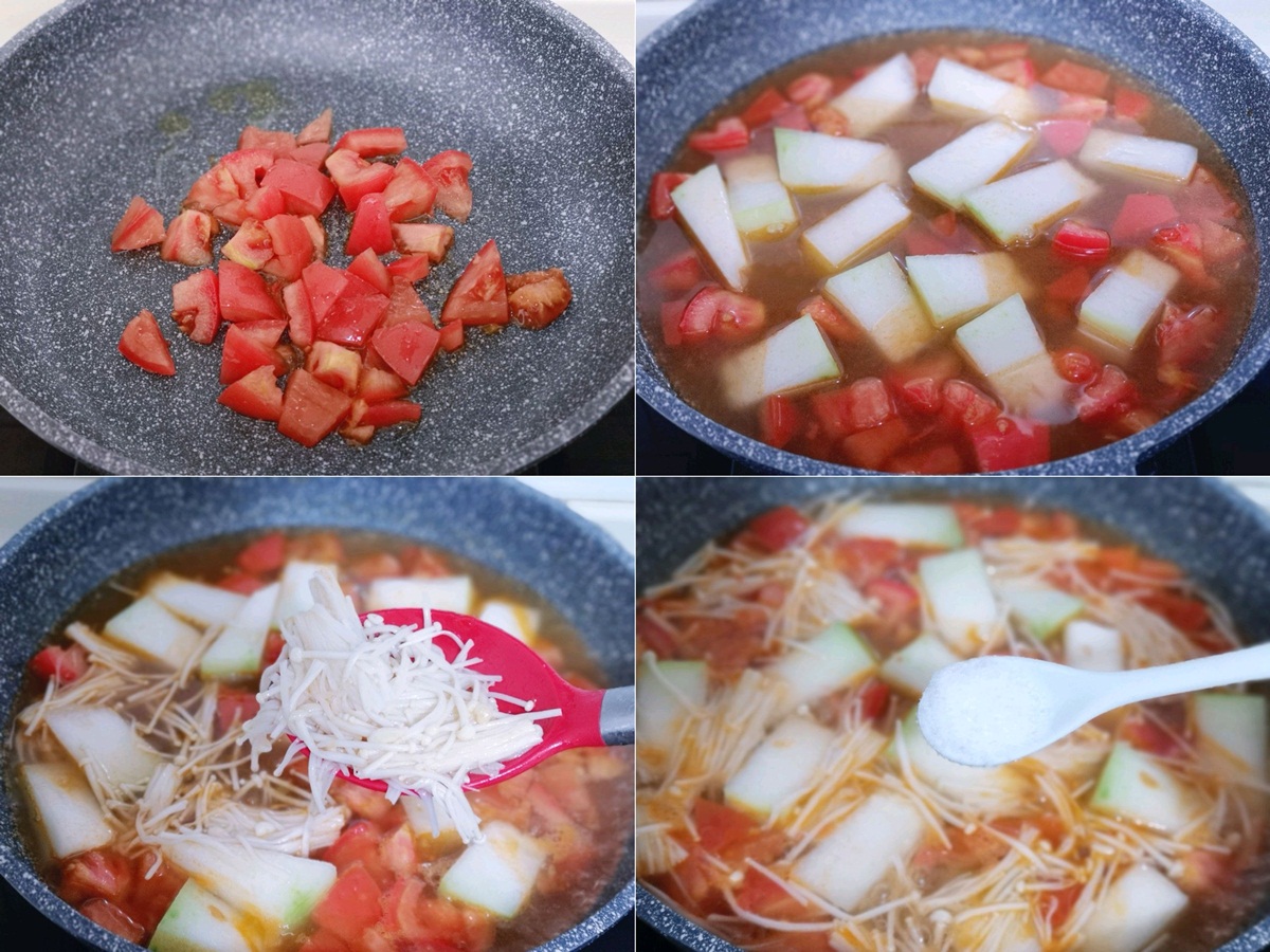 Bước 2: Đun nóng chút dầu ăn trong chảo, đổ cà chua vào xào mềm. Tiếp đó đổ lượng nước vừa ăn vào đun sôi. Khi nước sôi thì cho bí đao vào. Nấu cho bí đao chín tới thì thêm nấm kim châm, nêm thêm chút muối cho vừa ăn rồi nấu cho các nguyên liệu chín thì tắt bếp.