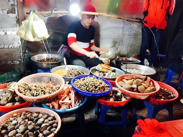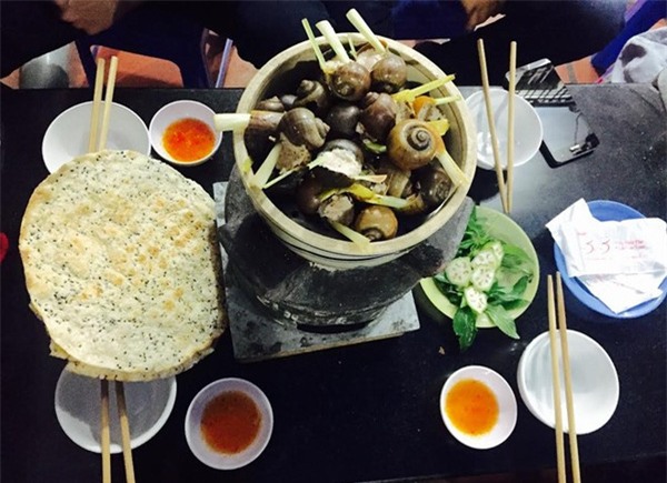ốc bươu nhồi thịt, nhâm nhi vài ly rượu đun nóng. Quán rất đông, kín