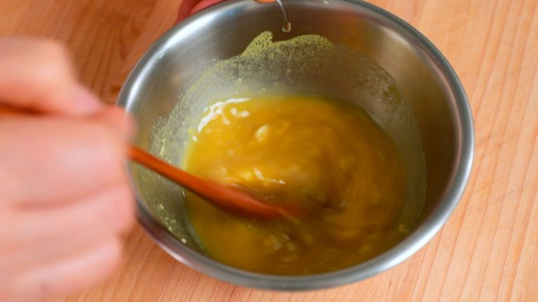 Bước 1: Cho bột mù tạt và nước ấm vào một cái bát nhỏ và trộn đều. Để yên trong 5 phút cho đến khi vị cay của bột mù tạt được trộn đều.
