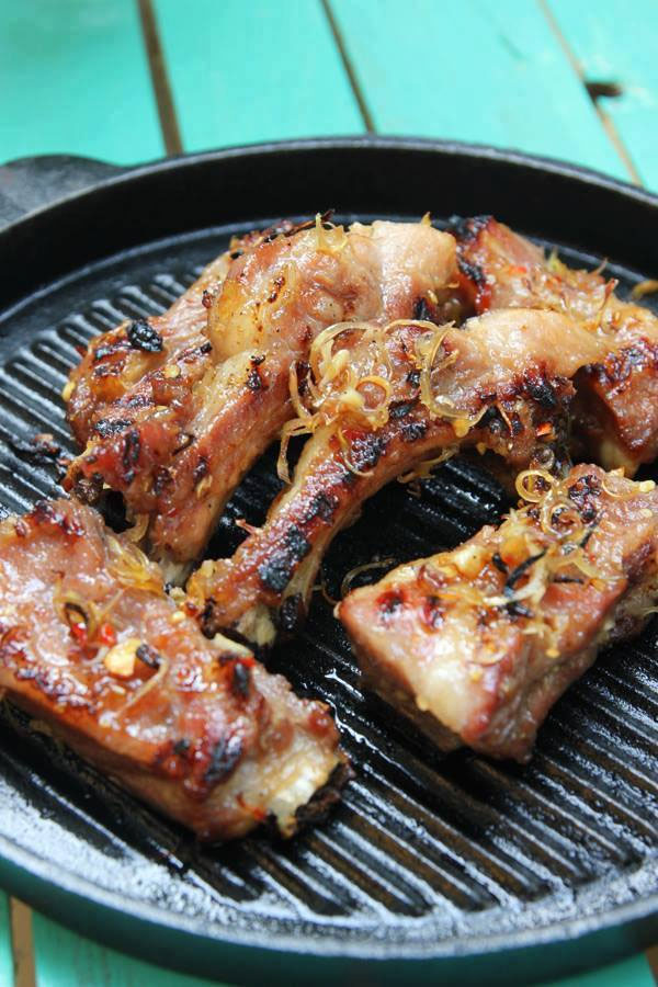 Nướng sườn trên than hoa. Nếu dùng lò nướng thì đặt nhiệt ở 250 độ C, nướng 20 phút rồi mở lò quết thêm nước ướp, lật mặt sườn nướng thêm 10 phút.