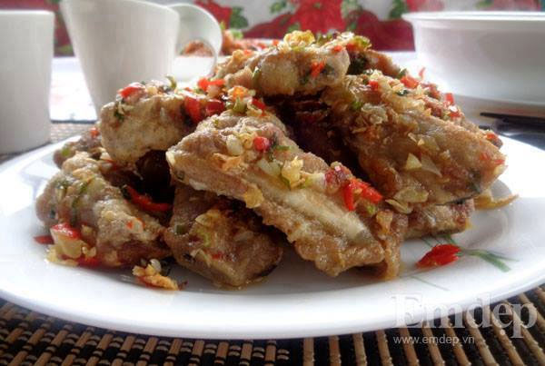 Cách làm: Sườn chặt miếng khoảng 2 cm, ướp sườn với tỏi băm và 1 thìa cà phê muối khoảng 10 phút. Cho sườn vào chảo chiên vàng.