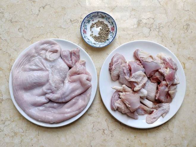 1 cái dạ dày lợn nhỏ đã được làm sạch, 1 nửa con gà nhỏ, gừng, nước sạch, muối, tiêu sọ.
