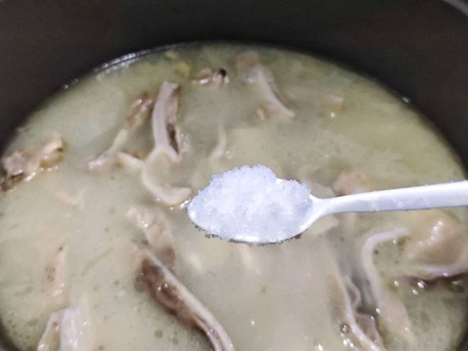Đổ dạ dày vừa thái xong trở lại nồi canh, thêm muối thích hợp, nấu thêm vài phút rồi tắt bếp.