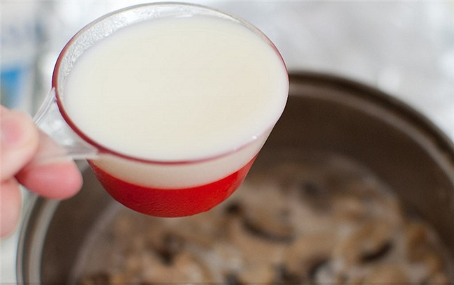 Phần sữa còn chừa lại thì cho thêm bột bắp (hoặc bột năng) vào hòa tan hết bột, rồi đổ vào trộn chung với nấm.