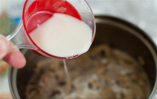 Sau đó cho sữa tươi (hoặc kem béo vào). Chừa lại một ít sữa.