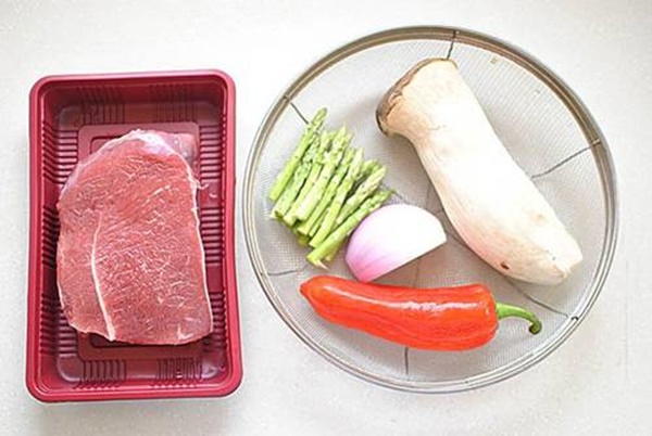 - 400gr thịt bò, 1 cây nấm đùi gà loại to (hoặc 2 cây nhỏ), 1 quả ớt chuông đỏ, 100gr măng tây, 1 củ hành tây, 1 thìa canh tinh bột ngô, 1 thìa canh rượu vang trắng.
