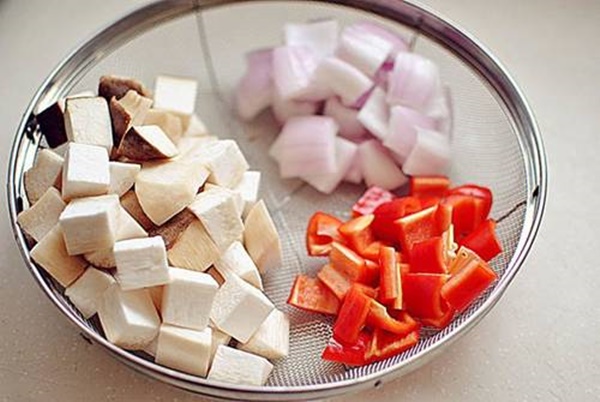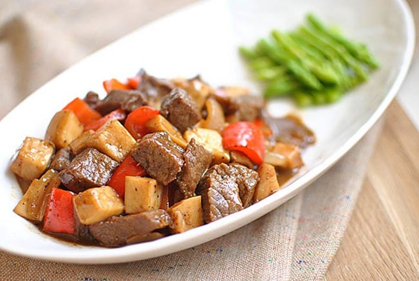 - Thịt bò rửa sạch, thấm khô, thái thành miếng vuông vừa ăn.