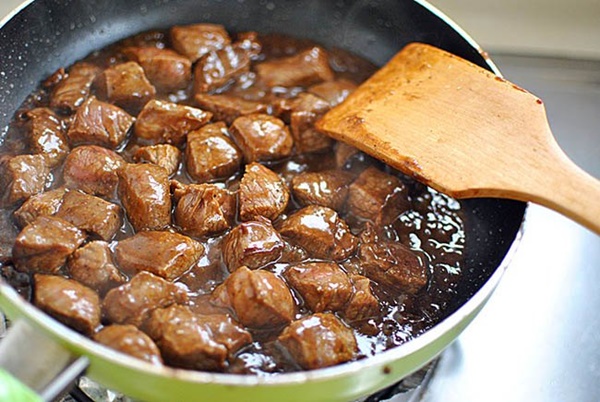 - Chuyển sang lửa to, đổ thịt bò vào chiên trên lửa lớn đến khi thịt chuyển màu, cháy cạnh.
