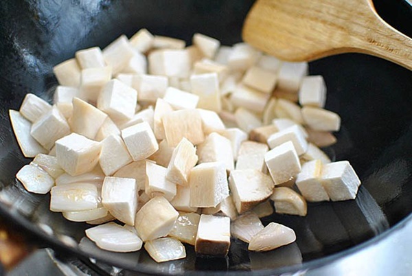 - Nấm rửa sạch, thái miếng vuông. Cách thái nấm này giúp nấm giòn hơn, ăn đã miệng hơn.