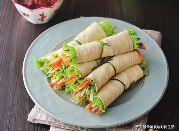 Váng đậu cuốn rau củ có thể được ăn kèm với nước sốt cà chua hoặc nước chấm tùy ý.