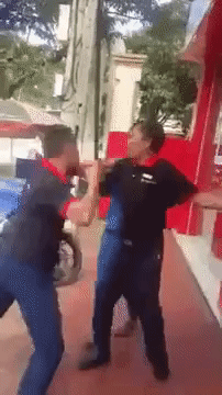 Tới đây, 2 nam nhân viên từ trong shop chạy ra, lao vào đấm khách hàng túi bụi mặc cho 1 nhân viên khác cố gắng can ngăn.