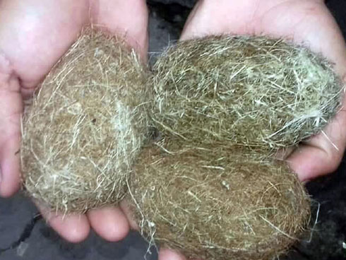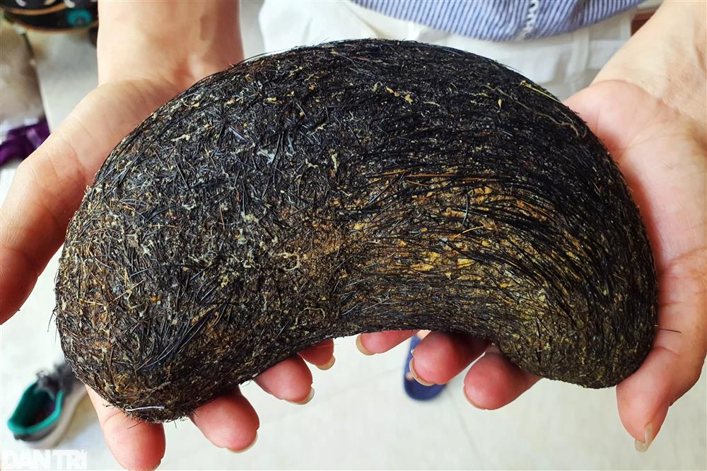 Theo quan sát của phóng viên Dân trí, vật được cho là cát lợn này có hình lưỡi liềm, mùi hương nhẹ, giống mùi thuốc bắc, bên ngoài có rất nhiều lông màu đen, cứng và cầm khá nặng tay.