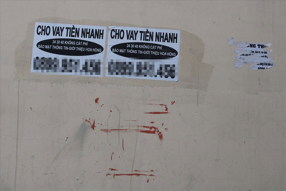 Rất nhiều quảng cáo cho vay tiền nhanh dán khắp các khu trọ của công nhân.