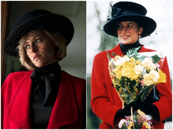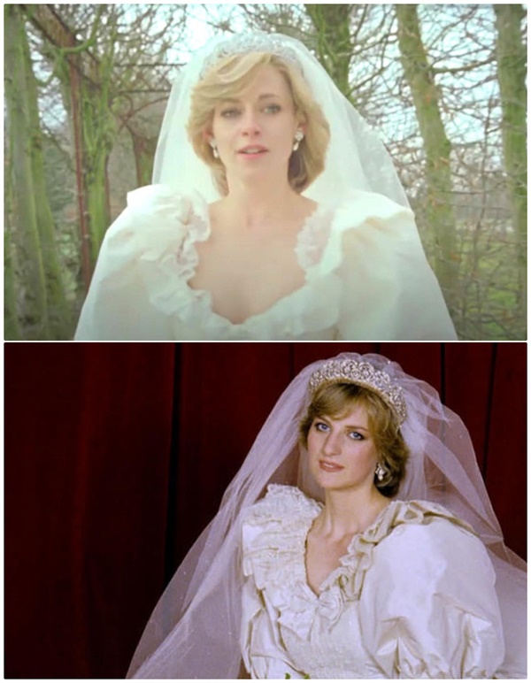 Chiếc vương miện nhà Spencer, thiết kế váy cưới tay bồng điểm xuyết chi tiết xếp bèo ngọt ngào của Công nương quá cố đều được tái hiện lại cụ thể, rõ ràng và chuẩn chỉnh nhất trong phiên bản 2021 của Kristen Stewart.