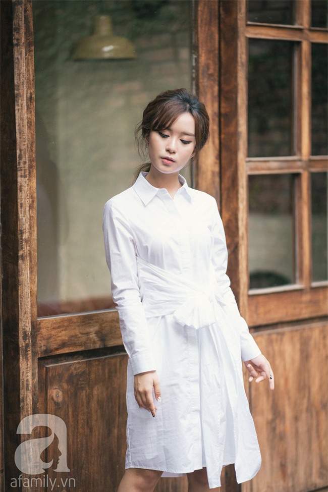 Ngay cả đến một thiết kế váy trắng trơn đơn giản cũng có những cách điệu ngọt ngào để bạn làm mới dáng váy sơmi suông quen thuộc.