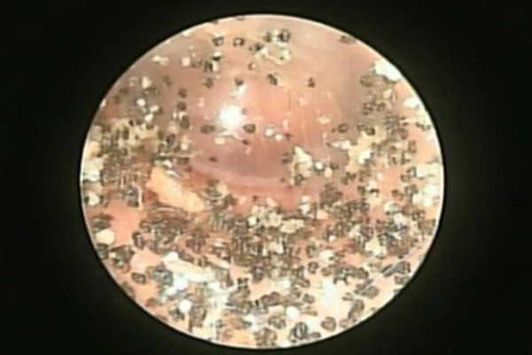 Ổ trứng ve chó nằm sâu trong ống tai trái bệnh nhi 7 tuổi qua hình ảnh nội soi tai.