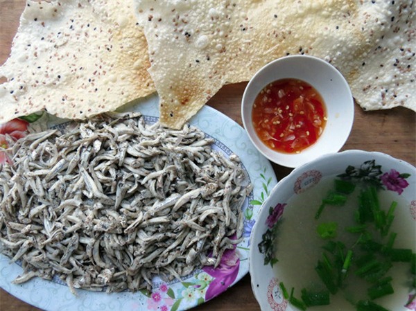 Bánh tráng gạo nướng giòn bẻ miếng vừa ăn rồi xúc cá cơm cho vào miệng nhai nghe sảng khoái cả người. Bánh tráng giòn thơm hòa cùng vị ngọt từ thịt cá “thấm” dần từ miệng xuống thực quản. Cả nhóm “gật gù” bên món cá cơm luộc xúc bánh tráng cùng ly rượu quê đậm đà hương vị.