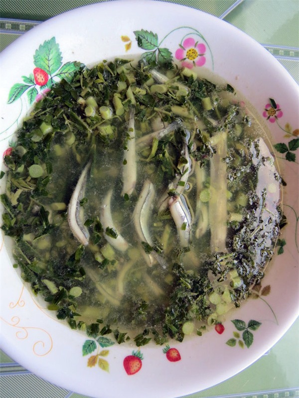 Bát cơm chan canh cá cơm nấu rau giút khiến cả nhà xì xụp khen ngon, vơi đi bao phiền muộn sau những muỗng canh nóng hổi.